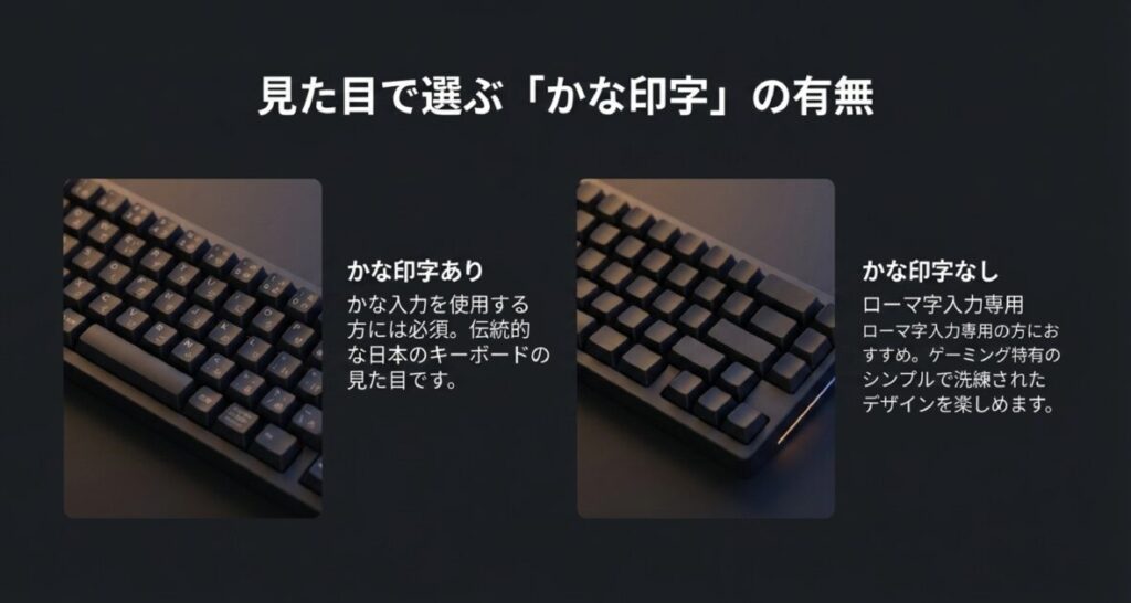 ゲーミングキーボードではカナなしの日本語配列モデルも増えており、英語配列のようなシンプルなデザインでありながら、JIS配列の使いやすさを備えた製品も選べます。見た目にこだわりたい方はカナなしモデルも検討してみましょう。